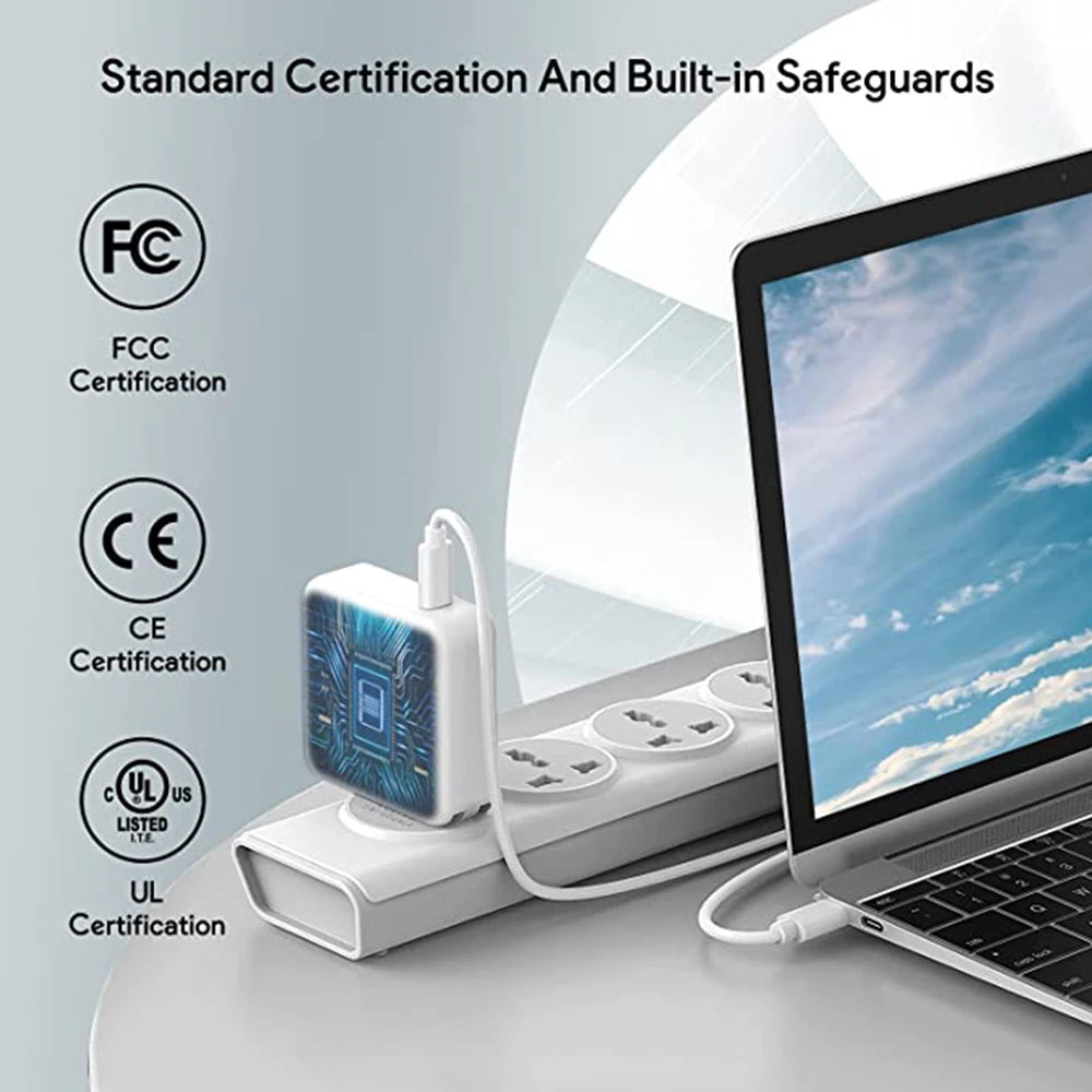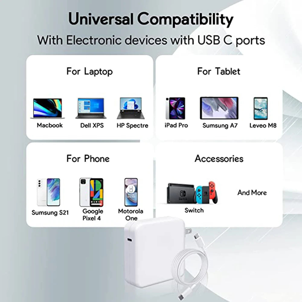 Engineered for the high-performance demands of the M1 and M2 chips, this charger seamlessly supports MacBook Pro (16, 15, 14, 13-inch, 2023–2016), MacBook Air, Dell, Lenovo, HP, iPad, and all USB-C devices. Automatic power identification ensures fast, efficient charging for laptops and smartphones.