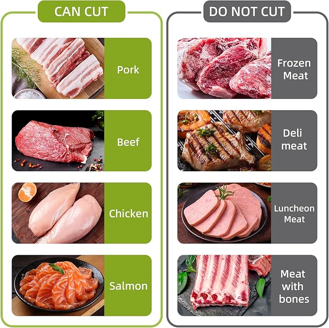 - DIKTE VERSTELBAAR: Deze handmatige vleesmachine voor vers vlees wordt geleverd met 2 messensets. Geniet van de flexibiliteit om vleesplakken van 2 of 4 mm te snijden, doe de vleesplakken terug in de container, snijd opnieuw en krijg vleesreepjes, blokjes, geniet eenvoudig van heerlijk eten zoals hotpot, rundvlees, zalmsushi. Tips (De messen zijn erg scherp, raak de messen niet aan met uw handen tijdens het gebruik en schoonmaken)